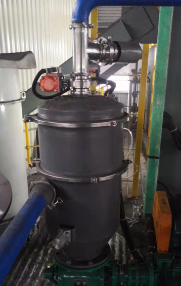 具體流程是,先開啟真空泵,然后氣動輸送系統(tǒng),最后將小袋拆包投料到投料站小料斗中。該系統(tǒng)采用連續(xù)性的輸送方式,輸送高度較高,輸送速度可以調(diào)節(jié),投料站下方料管有一個補氣手動閥,通過調(diào)節(jié)其開度,來控制輸送速度。通過工人師傅的安裝及工程師的現(xiàn)場調(diào)試,現(xiàn)在設(shè)備已經(jīng)正常運行,輸送速度可以達到1500KG/小時,完全滿足客戶使用要求。